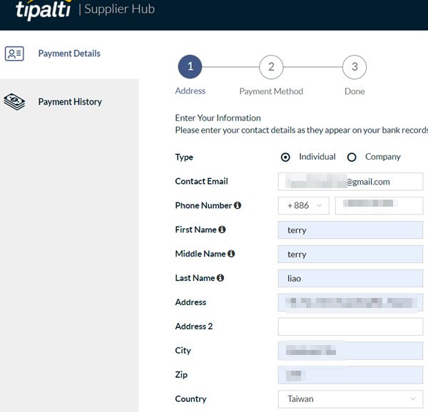 接下來我們就會登入到 Tipalti。登入到 Tipalti之後,我們填寫一下相關的資訊等等的。