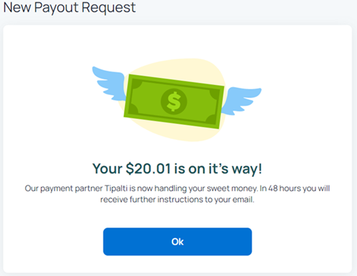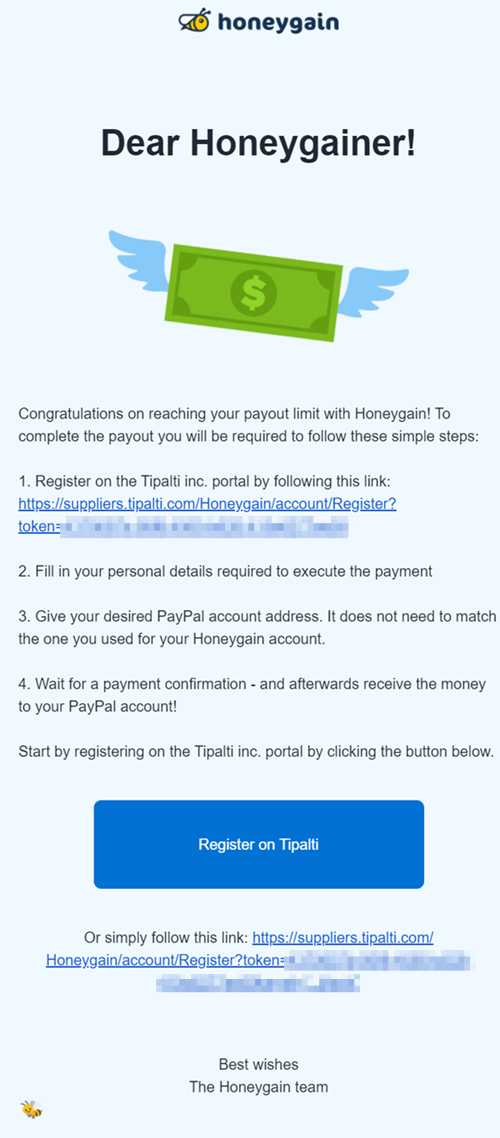 補充一下,它的這裡跳出來的訊息大約是說,目前 honeygain是用 tipalti來處理它的付款。所以我們會在 48個小時之後,在我們當初註冊的信箱中,收到下一步該怎麼做的說明。