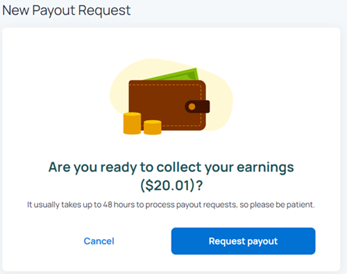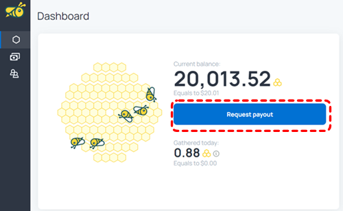 首先,我們登入 HONEYGAIN,只要到達最低提款金額 20USD之後,在下面紅框的地方,就會出現可以按的 Requrest payout藍色按鈕。就直接把它按下去。