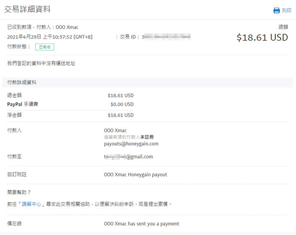 我大概等了一天,就收到款項。申請付款金額是 20.1,實收是 18.61塊。